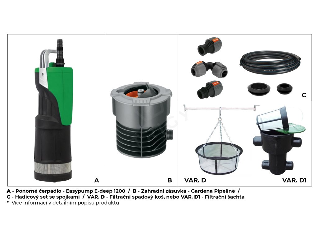 Systém nabízený v této sadě zajišťuje zcela bezstarostnou a jednoduchou obsluhu, navíc díky ponornému čerpadlu E-deep 1200 zabezpečí stálý a silný tlak vody.