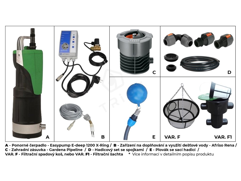 Systém nabízený v této sadě zajišťuje zcela bezstarostnou a jednoduchou obsluhu, navíc je opatřen dopouštěním z vodovodu v případě nedostatku dešťové vody v nádrži. Díky ponornému čerpadlu E-deep 1200 X-ring je zabezpečen stálý a silný tlak vody.