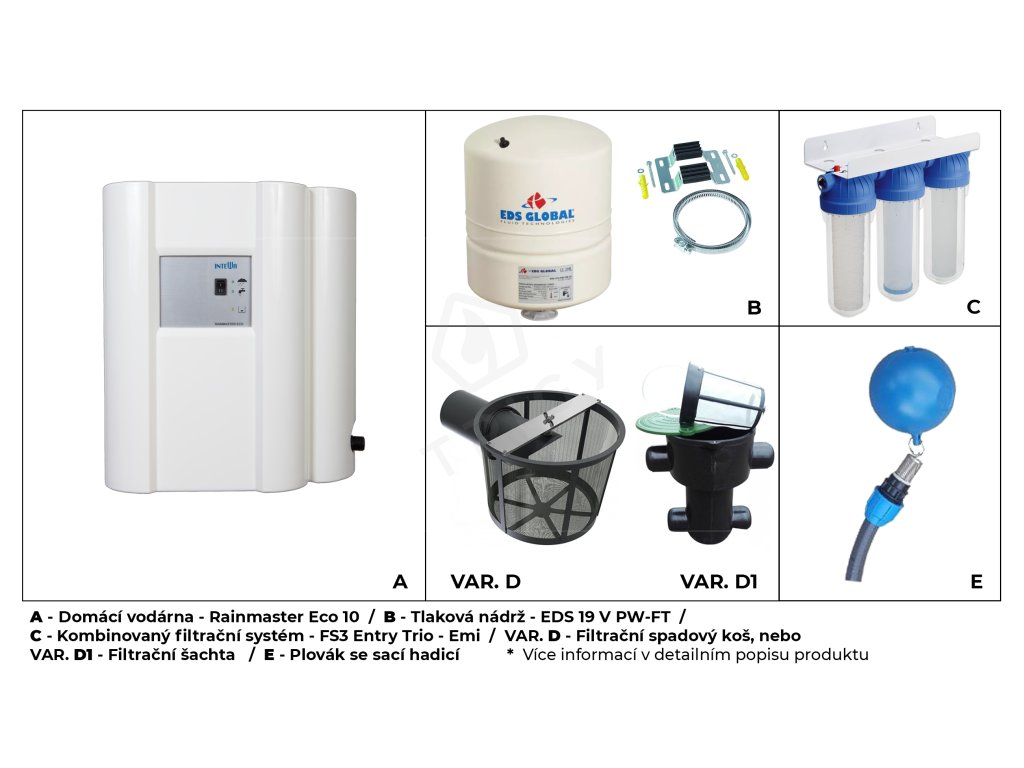 Sada pro zalévání zahrady a splachování WC dešťovou vodou označená jako ENERGETICKY ÚSPORNÉ je určena pro stavby k trvalému pobytu osob, jako jsou například rodinné nebo bytové domy. Podstatou systému je využít dešťovou vodu i v domácnosti, respektive zásobovat WC dešťovou vodou pro splachování. Dešťová voda po přečištění vnitřními filtry může být použita i k praní v automatické pračce nebo sprchování ve sprše. Systém lze využít i pro závlahu menší zahrady. Součástí sestavy je úsporná domovní vodárna Rainmaster Eco, která slouží pro zajištění dostatku vody v systému. Jednotka je schopná monitorovat aktuální hladinu dešťové vody uvnitř nádrže. Funguje na bázi přepínání mezi odběrem vody z akumulační nádrže a vodovodu. Při nasávání vody z nádrže je opatřena plovákem se sací hadicí. Voda je tímto způsobem čerpána u hladiny a nedochází k zanášení čerpadla nečistotami. Tlak a plynulý tok vody v domovním potrubí je regulován tlakovou nádobou.