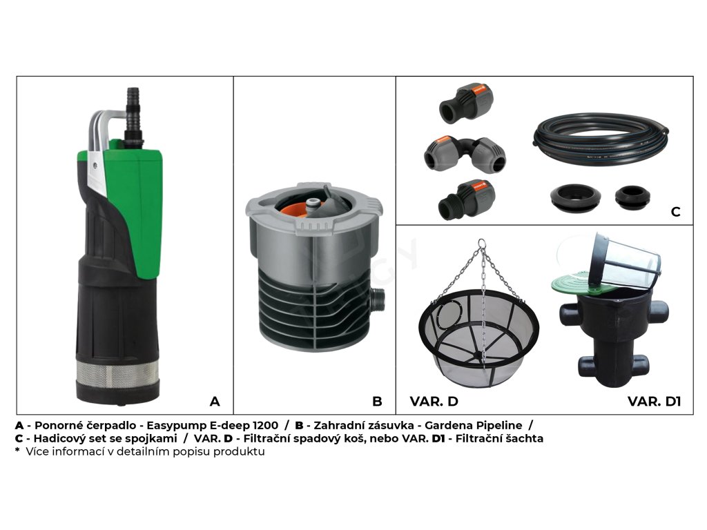 Systém nabízený v této sadě zajišťuje zcela bezstarostnou a jednoduchou obsluhu, navíc díky ponornému čerpadlu E-deep 1200 zabezpečí stálý a silný tlak vody.