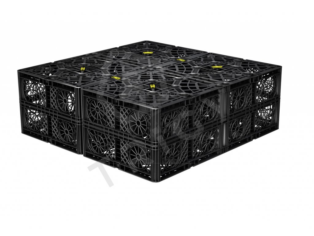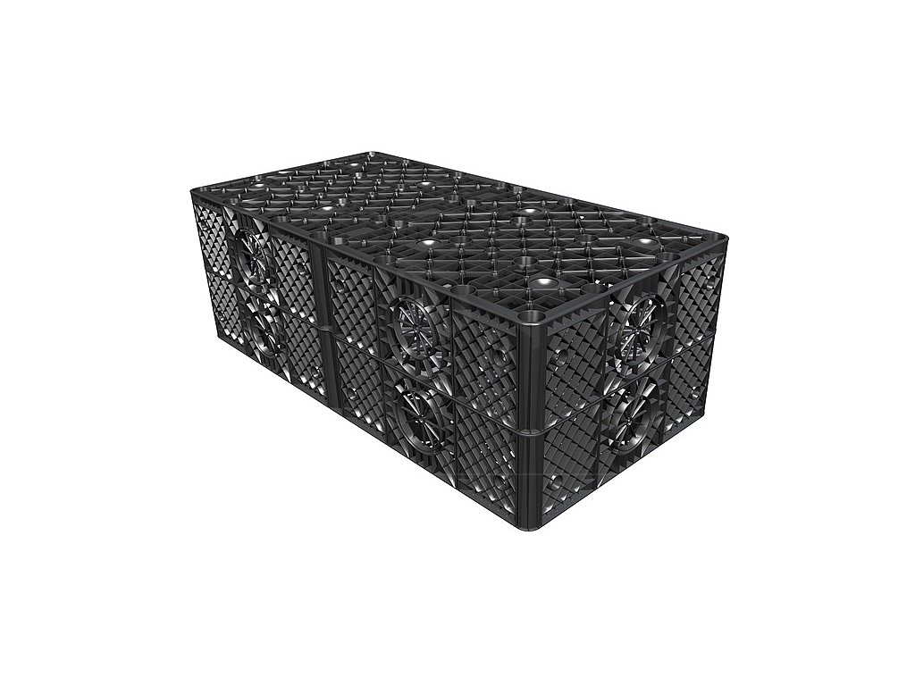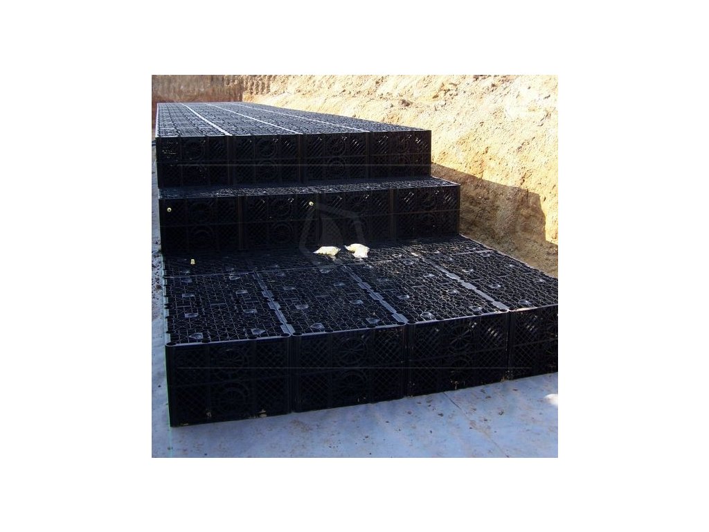 Garantia RAINBLOC COMPACT je vyroben ze 100% recyklovaného polypropylénu a má třikrát větší objem než štěrkové lože. 1 blok o hmotnosti 15 kg nahradí cca 800 kg štěrku nebo 36 m drenážního potrubí.